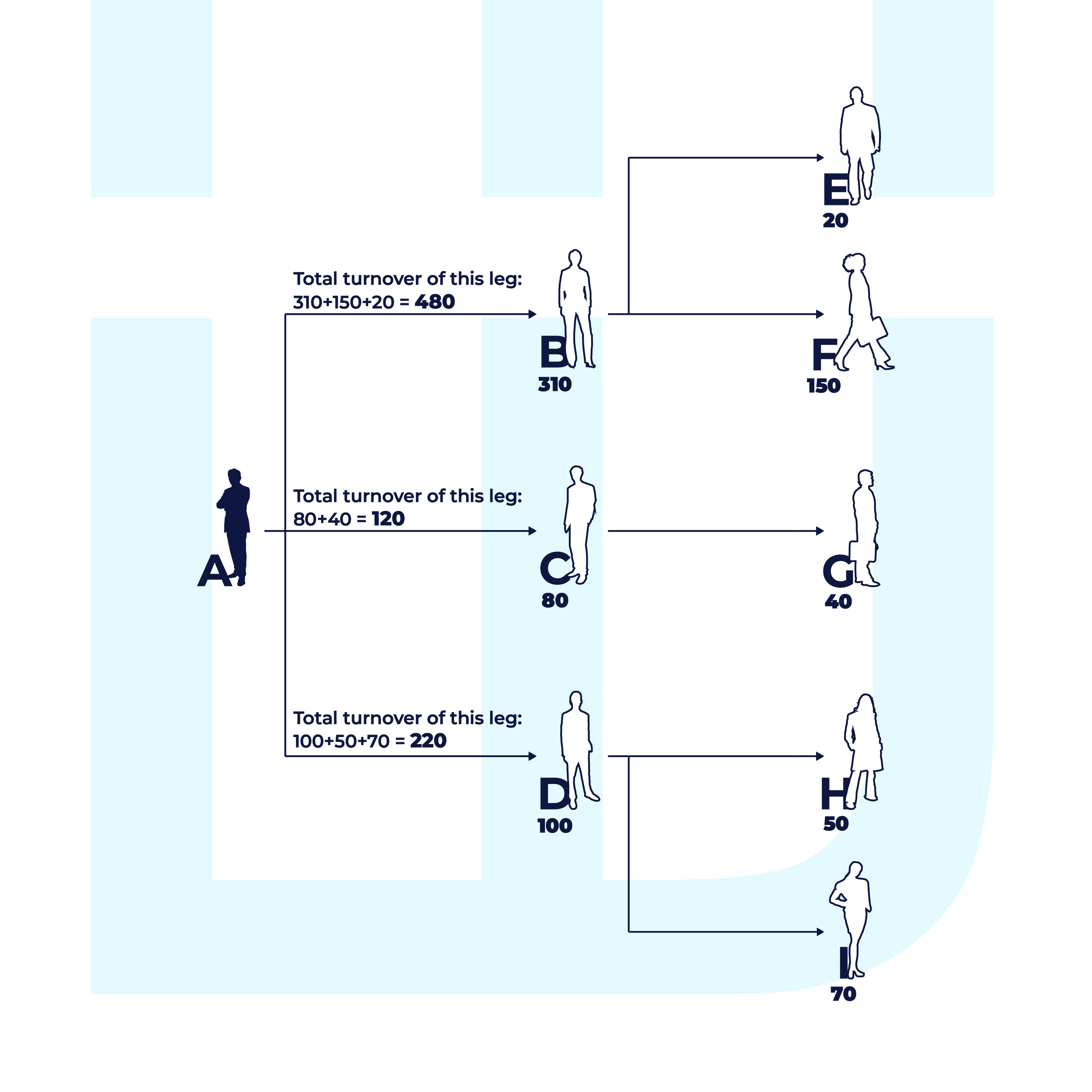 When the turnover is calculated, the strong leg and the weak leg of the user tree are identified. The Strong leg is the branch of the user with the higher total turnover compared to the other branches.